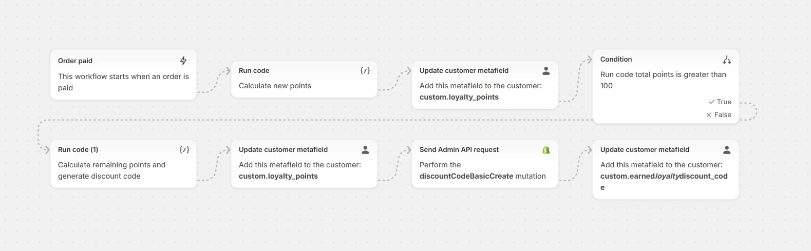 Shopify Flow can handle it without adding another app. By combining a flow, and a couple of metafields, you can create a basic setup that gives customers points and converts those points into discount codes when they reach a certain level.