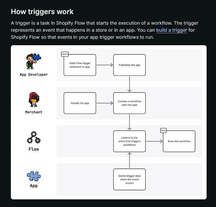 Shopify provides a feature that allows apps to define their own Flow triggers and actions. This applies to custom apps on Plus, and to public apps for non-Plus stores.
