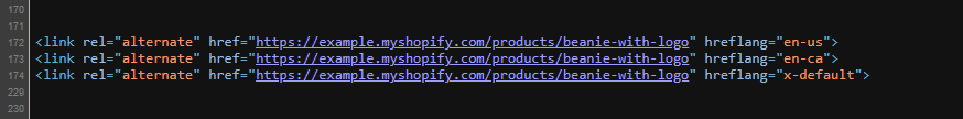 <link rel="alternate" href="{{ request.origin }}{{ request.path }}" hreflang="en-us"> <link rel="alternate" href="{{ request.origin }}{{ request.path }}" hreflang="en-ca"> <link rel="alternate" href="{{ request.origin }}{{ request.path }}" hreflang="x-default">Make sure the URLs match each page’s correct path. Open pages of 2-3 different templates, right click, and click "View page source". Then search for "hreflang".
