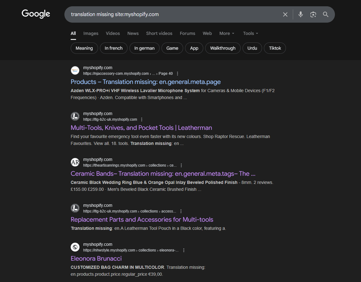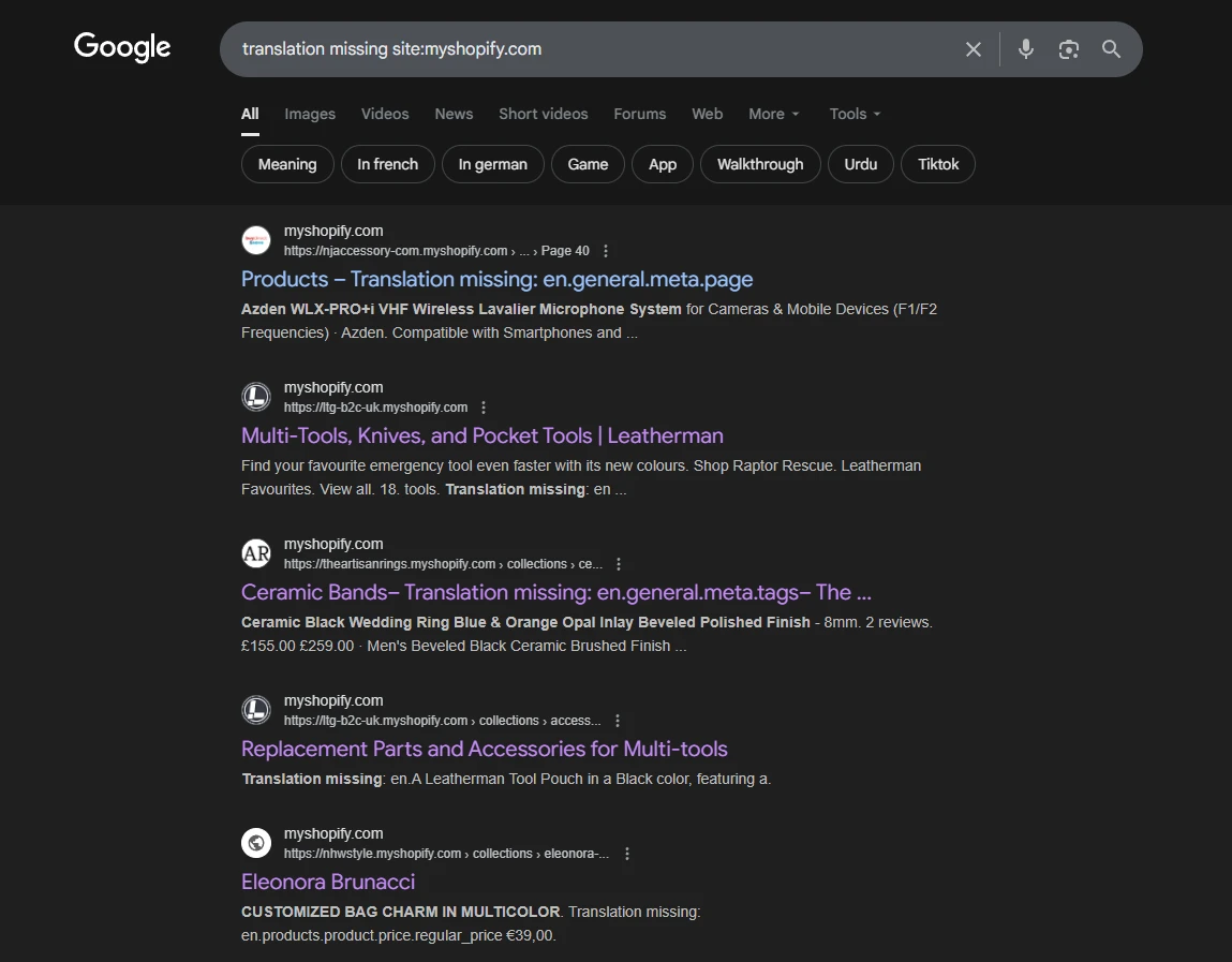 "translation missing" site:yourstorename.myshopify.comJust replace yourstorename.myshopify.com with your own domain.