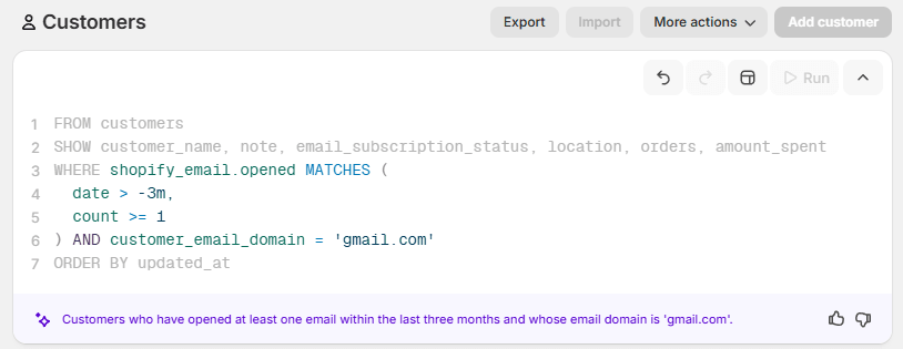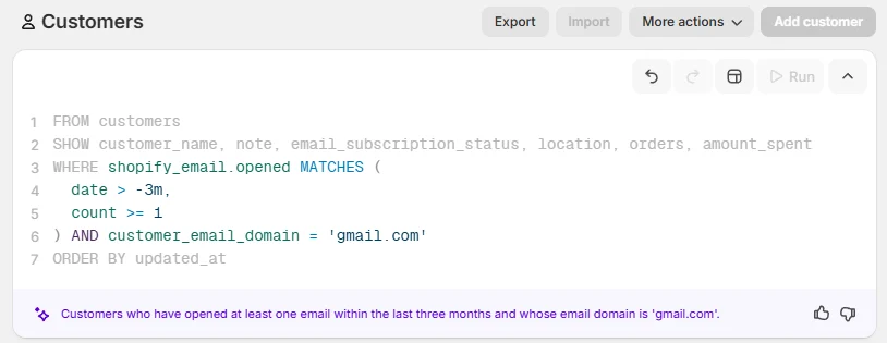 AND customer_email_domain = 'gmail.com'Apply and save the query as a segment.